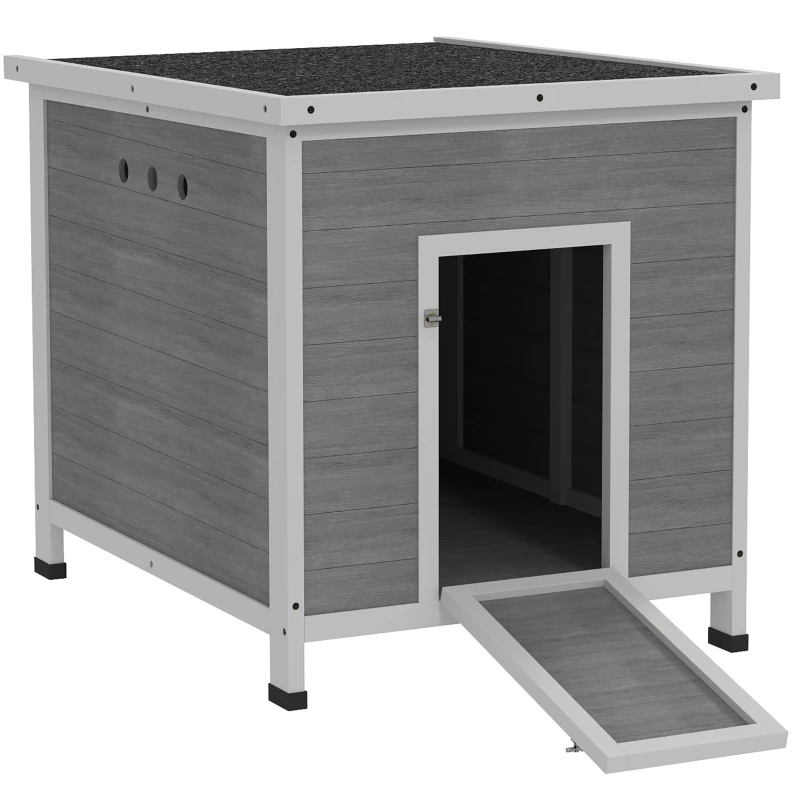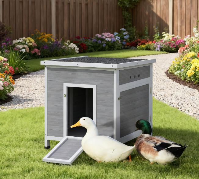 Features: - Openable top and removable floor simplify cleaning - Front door doubles as ramp for easy duck entry - Ventilation holes and elevated design ensure dry habitat - Side door provides owner easy access to ducks - Spacious living area accommodates 2-4 ducks or similarly sized poultry - Asphalt roof and waterproof paint protect from weather - Assembly required Specification: - Color: Light Gray - Material: Fir Wood - Overall Dimensions: 24.8" W x 32.3" D x 29.9" H - Main House: 22" W x 30.7" D x 26" H (Total), 22" W x 30.7" D x 26" H (Inner) - Front Door: 10.8" W x 17.7" H - Side Door: 26.6" W x 17.7" H - Height To The Floor: 3.3" H - Ventilation Hole: 1" Dia. Package Includes: - 1 x Duck House - 1 x Manual